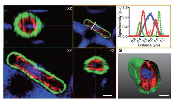 亮點:直徑2-3um的沙門氏菌,通過蔡司共聚焦配備的超高分辨率設備Airyscan(點擊查看),有效實現2倍分辨率提升,清晰定位GBPs在細菌表麵的結合(成像效果類似膜結構)並提高。